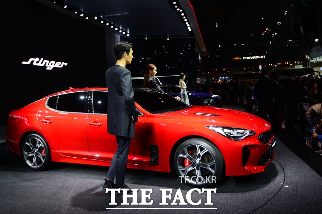 30일 오후 경기도 고양시 일산서구 킨텍스에서 2017 서울모터쇼가 열린 가운데 기아자동차의 프리미엄 스포츠 세단 스팅어가 공개되고 있다. 지난 2011년 열린 프랑크푸르트 모터쇼에서 큰 관심을 받은 스팅어는 2.0리터 세타II GDI 터보와 3.3리터 람다II GDI 트윈터보, 2.2리터 디젤 등 총 3가지 파워트레인을 사용한다. 2.0리터 가솔린 터보 모델의 경우 최고출력 255마력, 최대토크 36.0kg.m의 성능을 발휘한다. 3.3 트윈터보 모델은 370마력, 52.0kg.m의 토크를 자랑하고 제로백 5.1초의 이례적인 성능을 낸다.