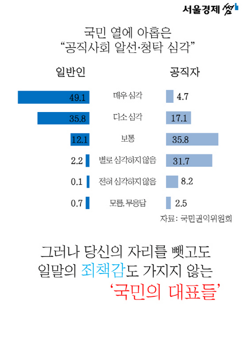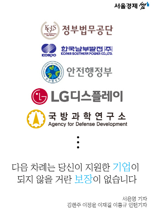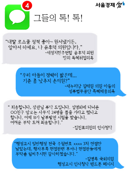 이런 가운데 터져나온 국회의원들의 인사·취업 청탁 뉴스는 취업준비생들의 눈살을 더욱 찌푸리게 합니다. 그들의 문자 한 통에 구직자 한 명은 자신에게 돌아올 일자리를 잃었을 수 있으니까요. /서은영기자, 김현주·이재길·이홍규·이정윤인턴기자 supia927@sed.co.kr