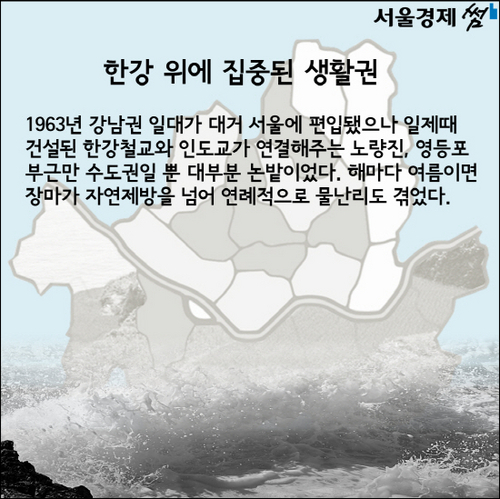 1963년 강남권 일대가 대거 서울에 편입됐지만 일제때 건설된 한강철교와 인도교가 연결해주는 노량진, 영등포 부근만 수도권일 뿐 대부분 논밭이었지요. 해마다 여름이면 장마로 인해 연례행사처럼 물난리도 겪었습니다.