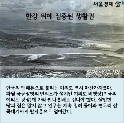 한국의 맨해튼으로 불리는 여의도 역시 마찬가지. 파월 국군장병의 면회소가 설치된 여의도 비행장(지금의 여의도 광장)에 가려면 나룻배로 건너야 했습니다. 살만한 땅과 집은 많지 않았고, 인구는 계속 밀려 들어와 변두리 산꼭대기까지 판자촌으로 덮여갔지요.