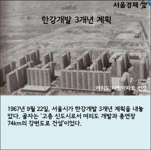 1967년 9월 22일, 서울시가 한강개발 3개년 계획을 내놓습니다. 골자는 ‘고층 신도시로서 여의도 개발과 총연장 74km의 강변도로 건설’이었습니다.