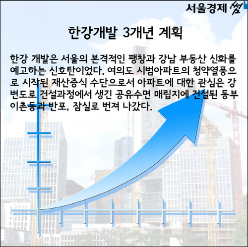 한강 개발은 서울의 본격적인 팽창과 강남 부동산 신화를 예고하는 신호탄이었습니다. 여의도 시범아파트의 청약열풍으로 시작된 재산증식 수단으로서 아파트에 대한 관심은 강변도로 건설과정에서 생긴 공유수면 매립지에 건설된 동부이촌동과 반포, 잠실로 번져 나갔습니다.