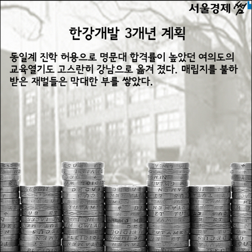 동일계 진학 허용으로 명문대 합격률이 높았던 여의도의 교육열기도 고스란히 강남으로 옮겨 졌고, 매립지를 불하받은 재벌들은 막대한 부를 쌓게됩니다.