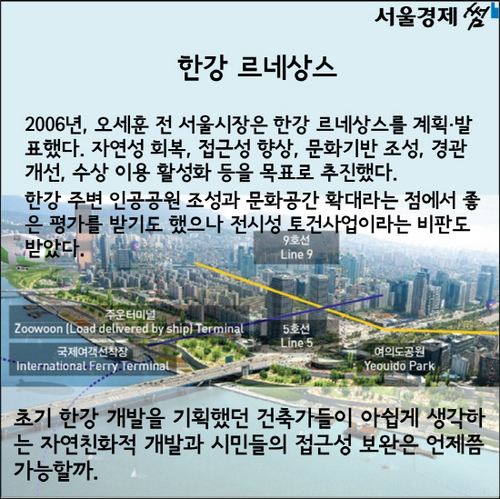 2006년, 오세훈 전 서울시장은 한강 르네상스를 계획·발표합니다. 자연성 회복, 접근성 향상, 문화기반 조성, 경관 개선, 수상 이용 활성화 등을 목표로 추진했습니다. 한강 주변 인공공원 조성과 문화공간 확대라는 점에서 좋은 평가를 받기도 했으나 전시성 토건사업이라는 비판도 만만치 않았습니다. 과연 초기 한강 개발을 기획했던 건축가들이 아쉽게 생각하는 자연친화적 개발과 시민들의 접근성 보완은 언제쯤 가능할까요. /김경훈 기자·박송이 인턴기자 styxx@sed.co.kr