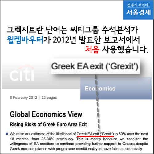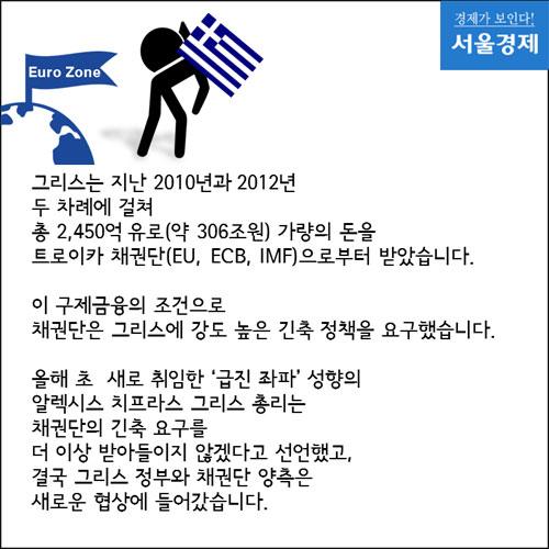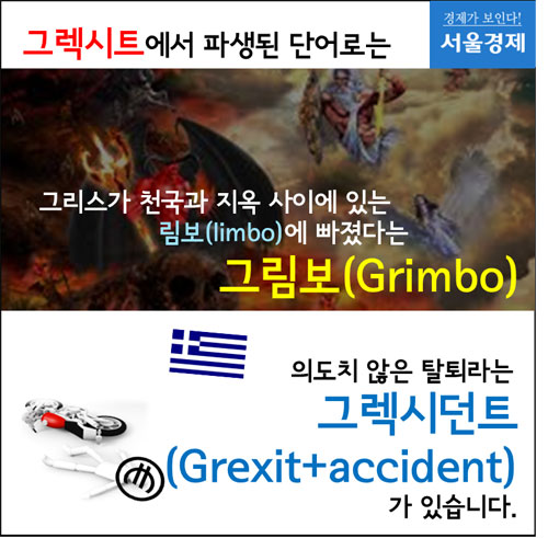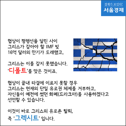 ‘그렉시트’란 말이 회자되고 있습니다. ‘그리스’와 나가다란 의미의 ‘Exit’가 결합한 이 조어의 의미, 그리고 현재의 ‘그리스 사태’를 서울경제신문이 카드뉴스를 통해 전해드립니다.