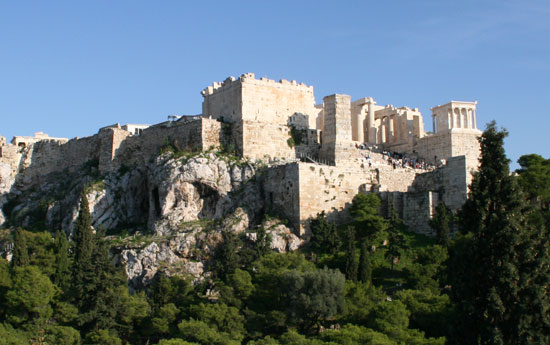 아크로폴리스를 직역하면 '높은 도시'라는 뜻이지만 아테네 아크로폴리스는 높이가 해발 156m에 불과해 산이라기보다는 언덕에 가깝다. 아크로폴리스의 거대한 관문인 프로필라이아를 통과하면 전면에 파르테논 신전이 펼쳐진다. 높이 10m의 도리아식 기둥 46개로 이뤄진 파르테논 신전은 2,500년 전 고대 아테네의 영광을 그대로 간직한 듯 웅장한 모습으로 보는 이를 압도한다.