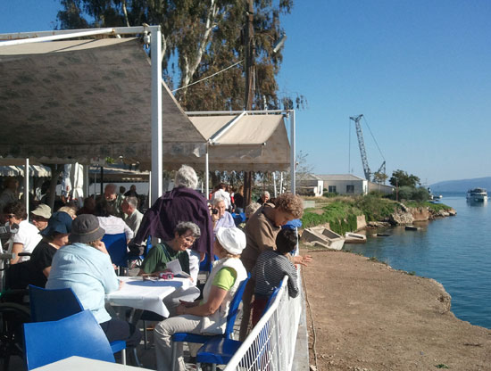 | | 코린트 운하 부근 노천카페에서 여유로운 시간을 보내는 관광객들. |