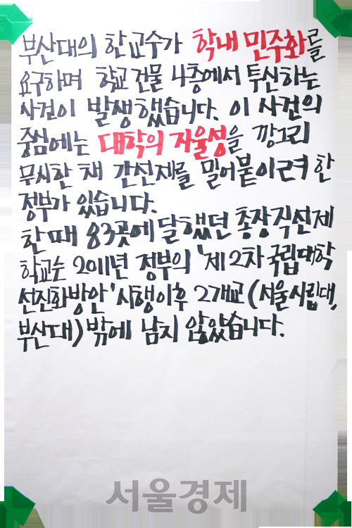 부산대의 한 교수가 최근 학내 민주화를 요구하며 투신 자살하는 사건이 벌어졌다.