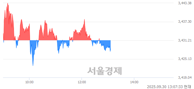 30일 오후 1시 7분 현재 코스피는 전일 대비 2.95p(-0.09%) 내린 3428.26로, 39(매도):61(매수)의 매수우위를 기록 중이다.
