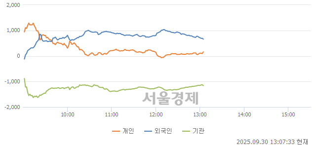 투자자별 동향을 살펴보면, 개인과 외국인 동반 매수세를 보이고 있으나, 기관의 '팔자' 기조에 밀리고 있다. 개인은 172억, 외국인은 637억을 순매수 중이며, 기관은 1,151억을 순매도하고 있다.