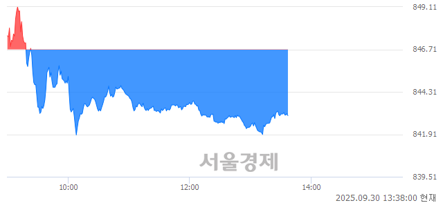 30일 오후 1시 37분 현재 코스닥은 전일 대비 3.74p(-0.44%) 내린 842.97로, 37(매도):63(매수)의 매수우위를 기록 중이다.