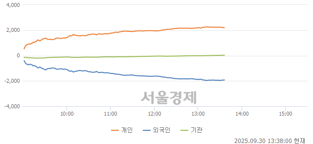 투자자별 동향을 살펴보면, 개인과 기관 동반 매수세를 보이고 있으나, 외국인의 '팔자' 기조에 밀리고 있다. 개인은 2,191억, 기관은 34억을 순매수 중이며, 외국인은 1,912억을 순매도하고 있다.