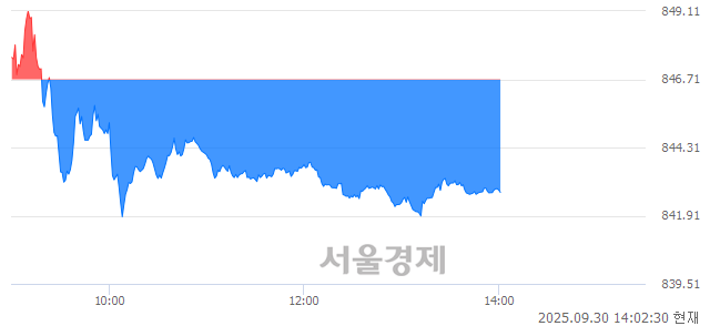 30일 오후 2시 2분 현재 코스닥은 전일 대비 3.98p(-0.47%) 하락한 842.73로, 37(매도):63(매수)의 매수우위를 기록 중이다. (※매수비율(%)=매수잔량/잔량합계*100, 매수우위=매수비율>매도비율)