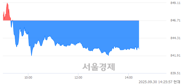 30일 오후 2시 25분 현재 코스닥은 전일 대비 3.79p(-0.45%) 하락한 842.92로, 37(매도):63(매수)의 매수우위를 기록 중이다. (※매수비율(%)=매수잔량/잔량합계*100, 매수우위=매수비율>매도비율)