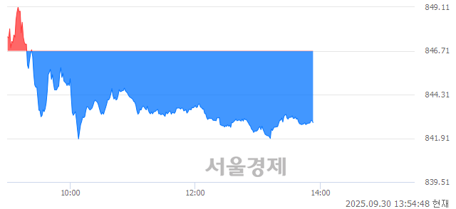 30일 오후 1시 54분 현재 코스닥은 전일 대비 4.03p(-0.48%) 하락한 842.68로, 37(매도):63(매수)의 매수우위를 기록 중이다. (※매수비율(%)=매수잔량/잔량합계*100, 매수우위=매수비율>매도비율)